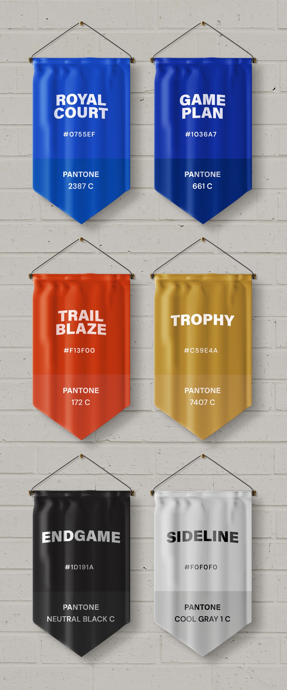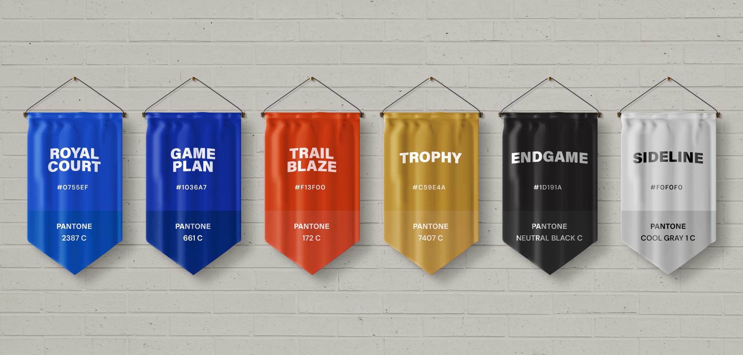 The colour palette reinforces that same energy and purpose. Royal Court leads as the primary blue, bright and unmistakable in its presence, supported by Game Plan, a deep navy that adds contrast and stability. Trail Blaze introduces a high-impact orange for moments of emphasis, while Trophy brings a refined gold tone that nods to achievement and success. Endgame anchors the system with a rich black, and Sideline provides an off-white counterpoint that allows the palette to breathe.
