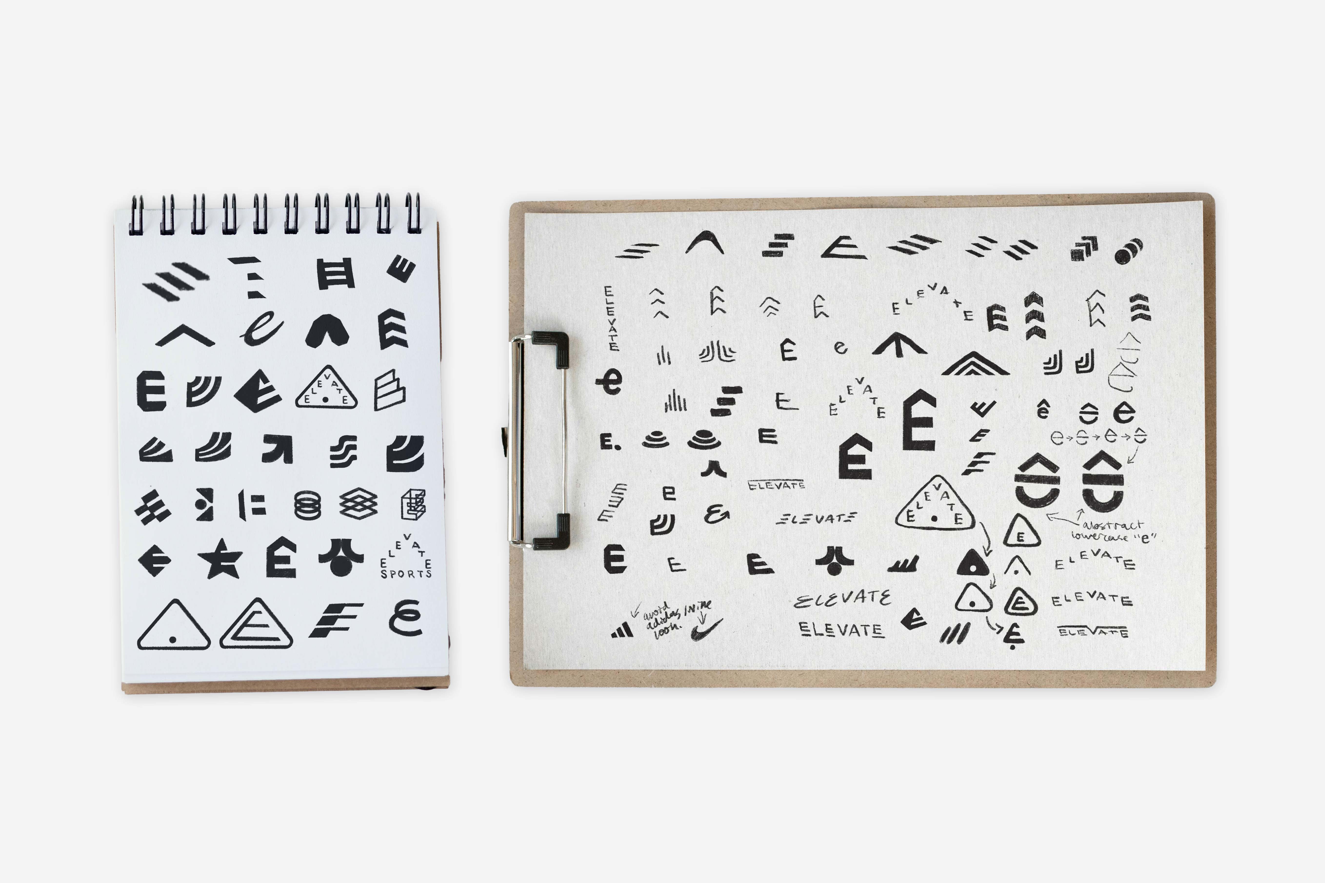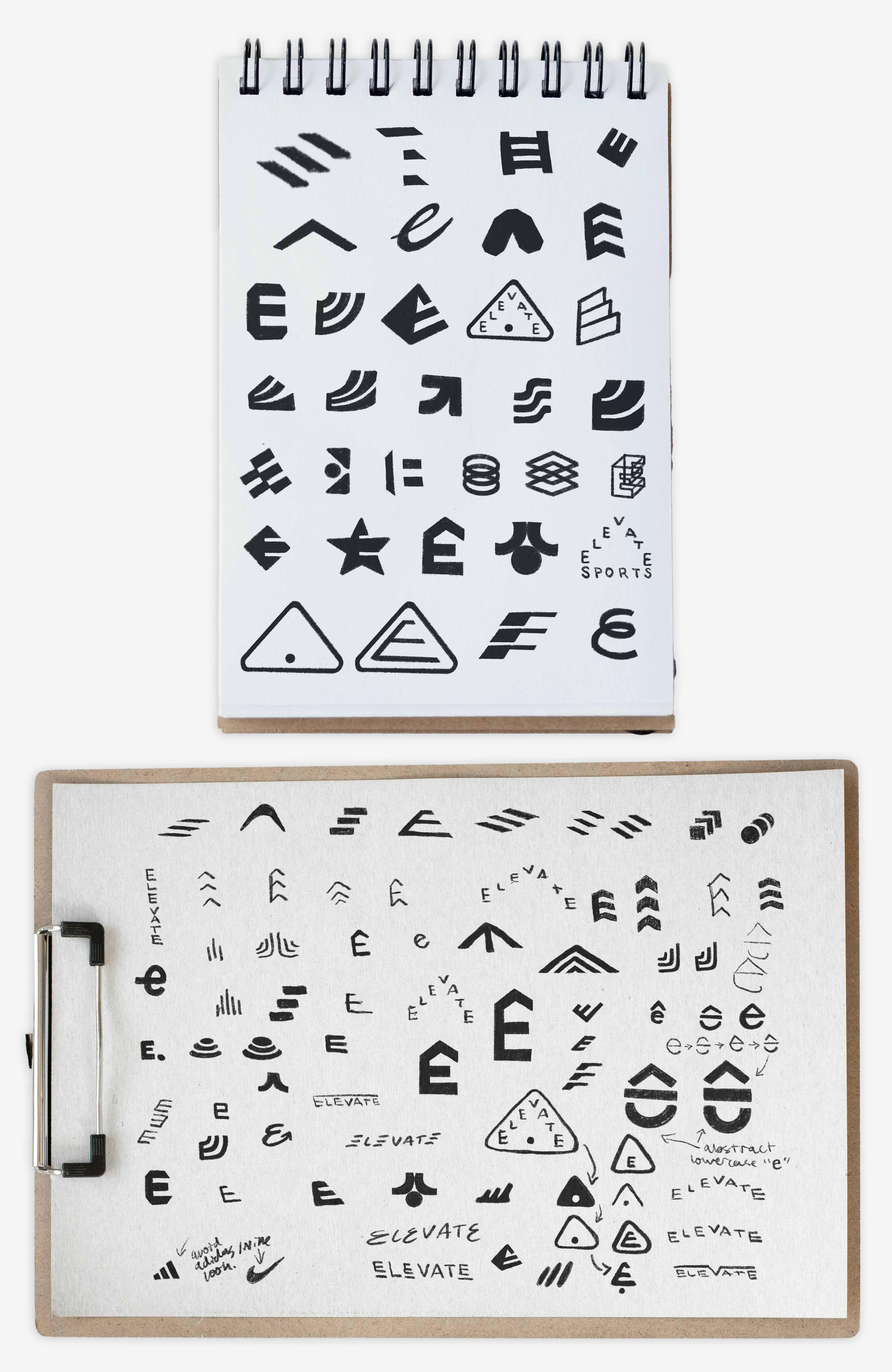 With the strategic direction in place, the process moved into a deep exploration of form and symbolism. Dozens of sketch iterations were developed, breaking down letterforms, testing abstract “E” concepts, and experimenting with upward shapes that conveyed elevation, momentum, and strength. Through this hands-on exploration, the pyramid-inspired structure emerged as the most natural and meaningful solution—grounded, aspirational, and reflective of Elevate’s role in guiding athletes toward their peak and beyond.