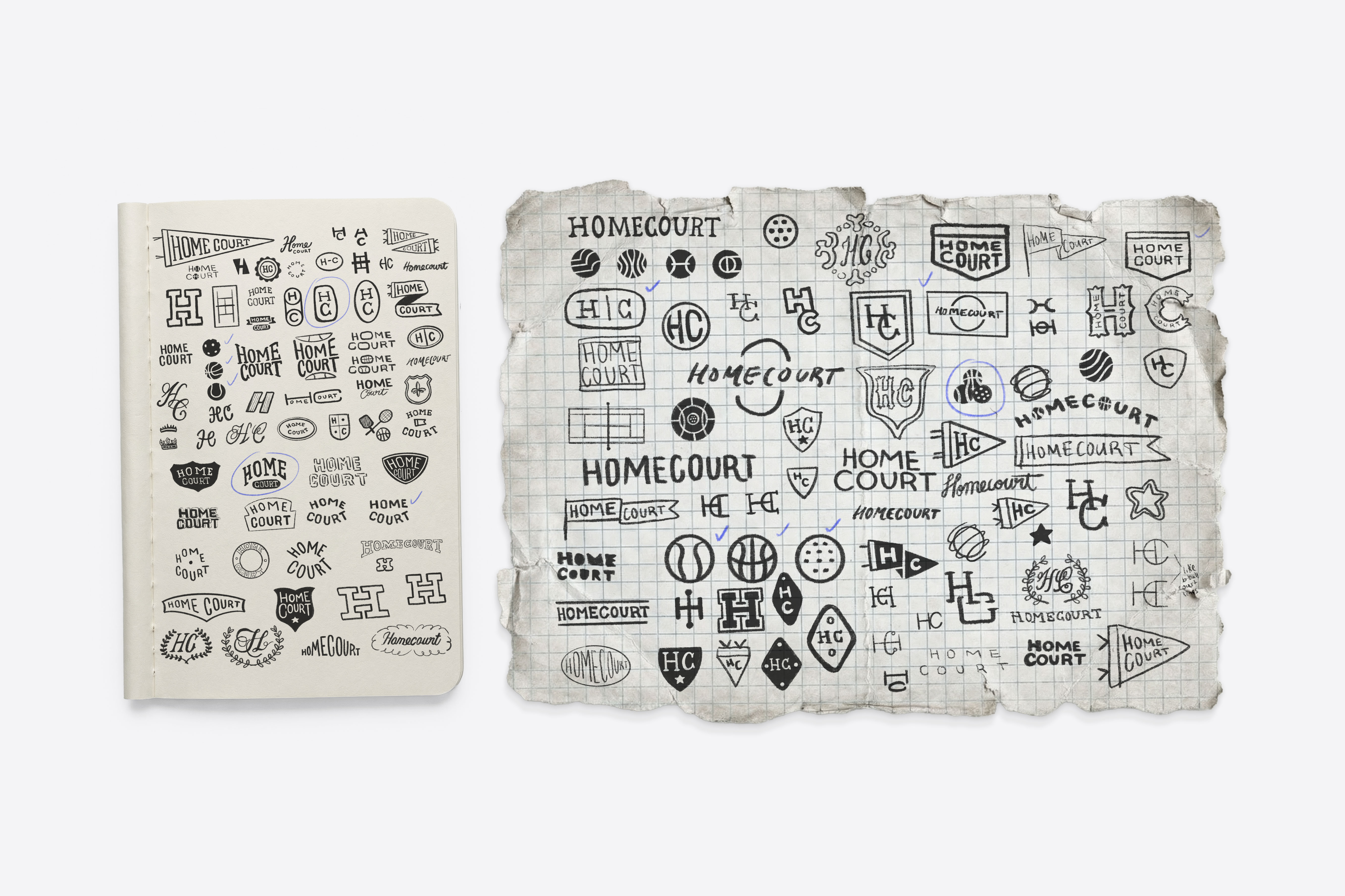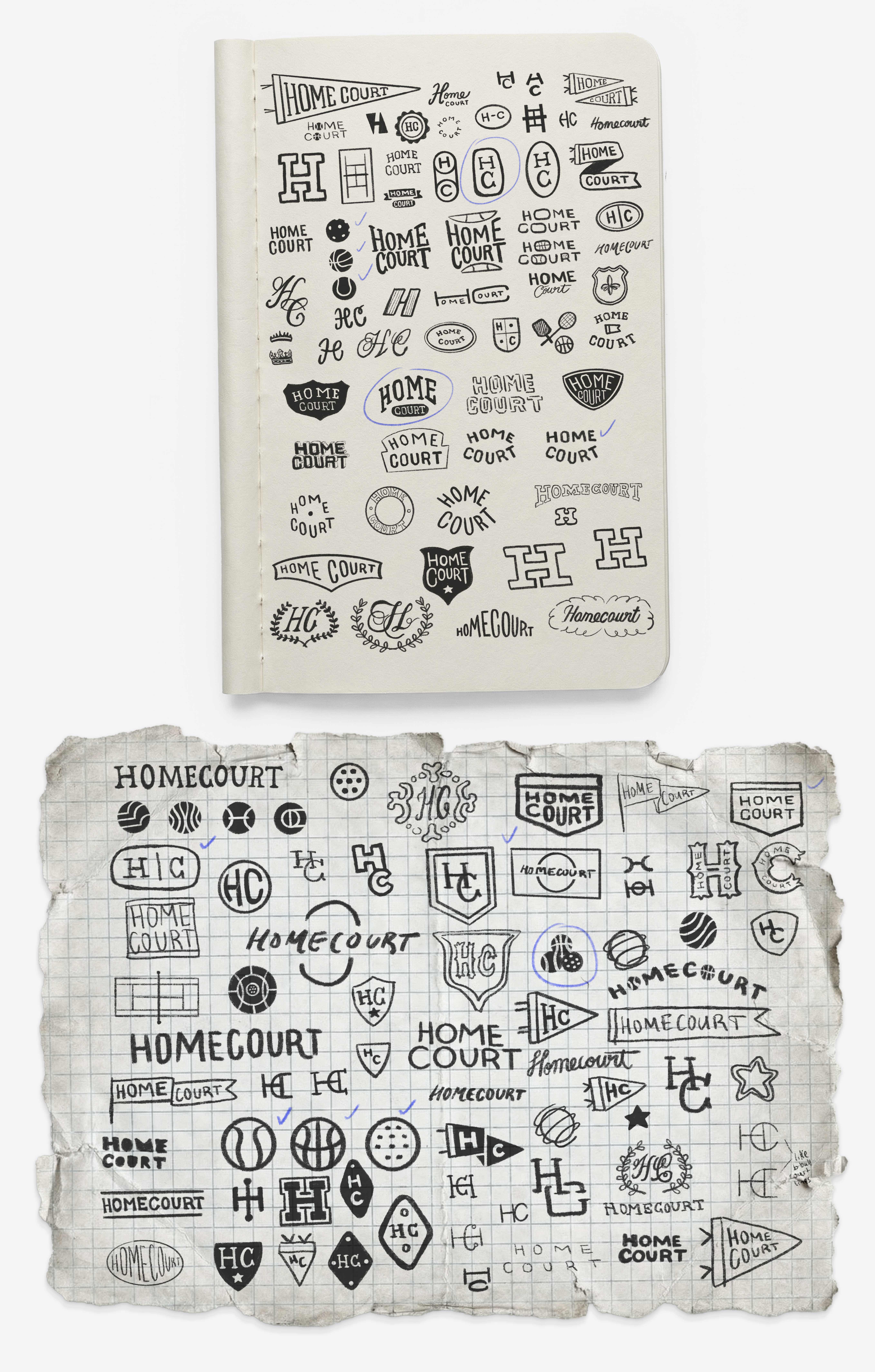 Like all of my identity projects, the Homecourt logo began on paper. I explored a wide range of directions, including sports ball symbols, monograms, crests, and “HC” initial lockups, searching for a mark that felt rooted in classic sport culture while still being timeless and versatile. Three core directions were developed through this process, with one idea quickly emerging as the foundation for the final identity, a direction that can be seen taking shape in the early sketches.