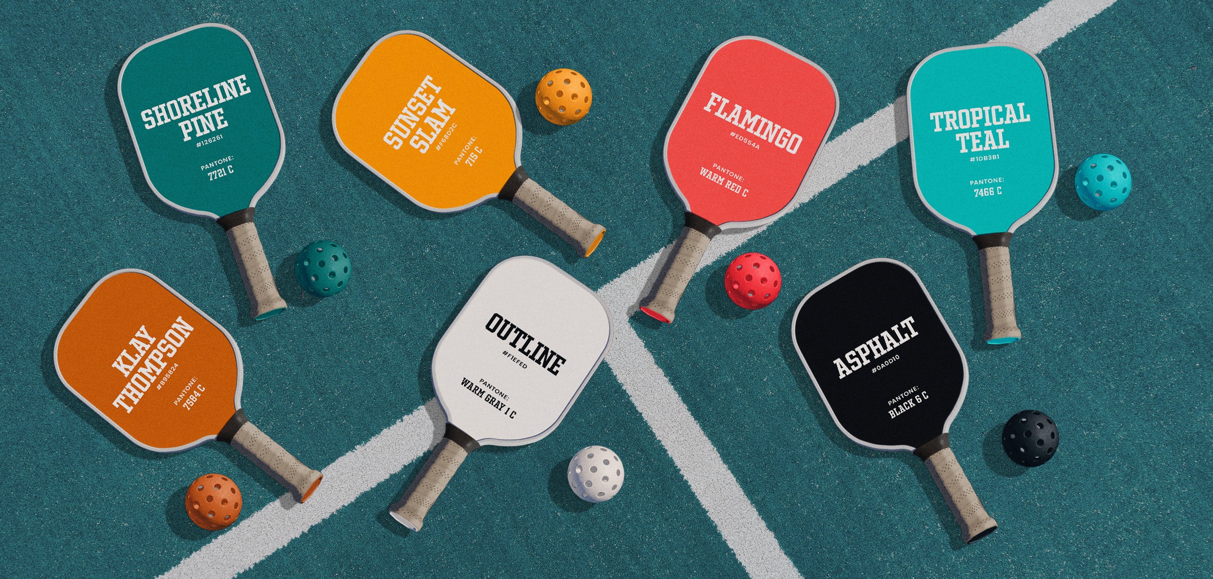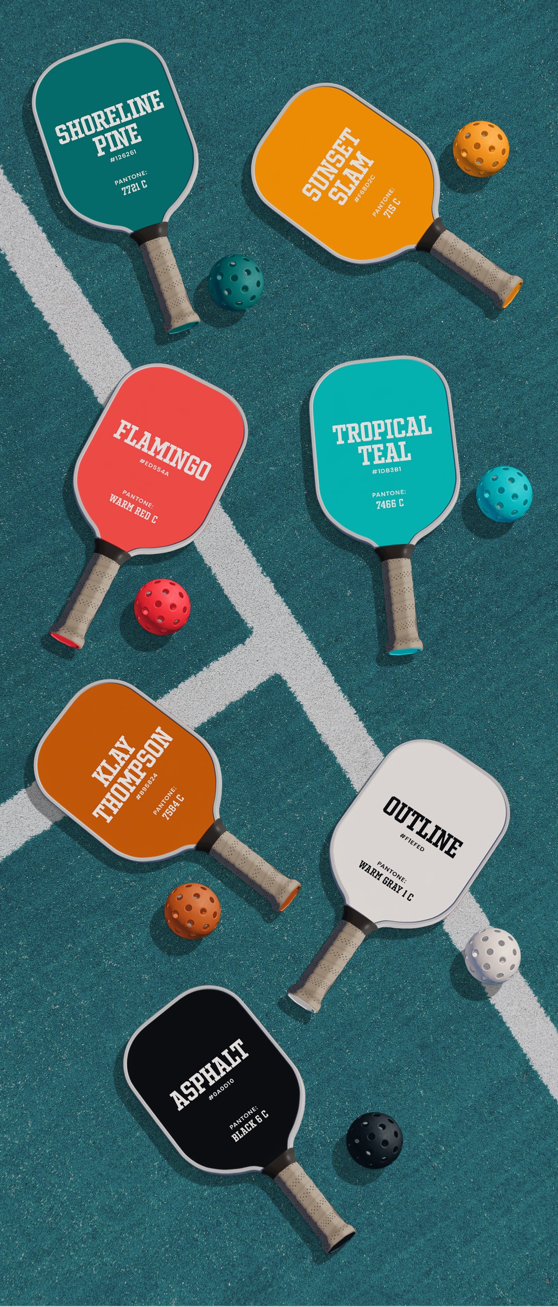 The colour palette was designed to feel bright, playful, and instantly recognizable, rooted in the environments Homecourt works within. Shoreline Pine serves as the primary tone, a deep teal inspired by traditional court surfaces for tennis, pickleball, and wall ball. It’s supported by Sunset Slam, a high-contrast orange that brings energy and visibility, Flamingo, a warm coral nodding to Florida and sun-soaked club culture, and Tropical Teal, a lighter, ocean-inspired hue that leans into Miami and beachside sport influences. Klay Thompson, a rusty clay orange, references clay tennis courts while adding a subtle basketball tie-in through its naming. Outline, an off-white, and Asphalt, a rich black, ground the system and echo the fundamental materials of the game: painted lines and asphalt surfaces. Together, the palette captures the spirit of summer sport while giving the brand flexibility, depth, and personality.