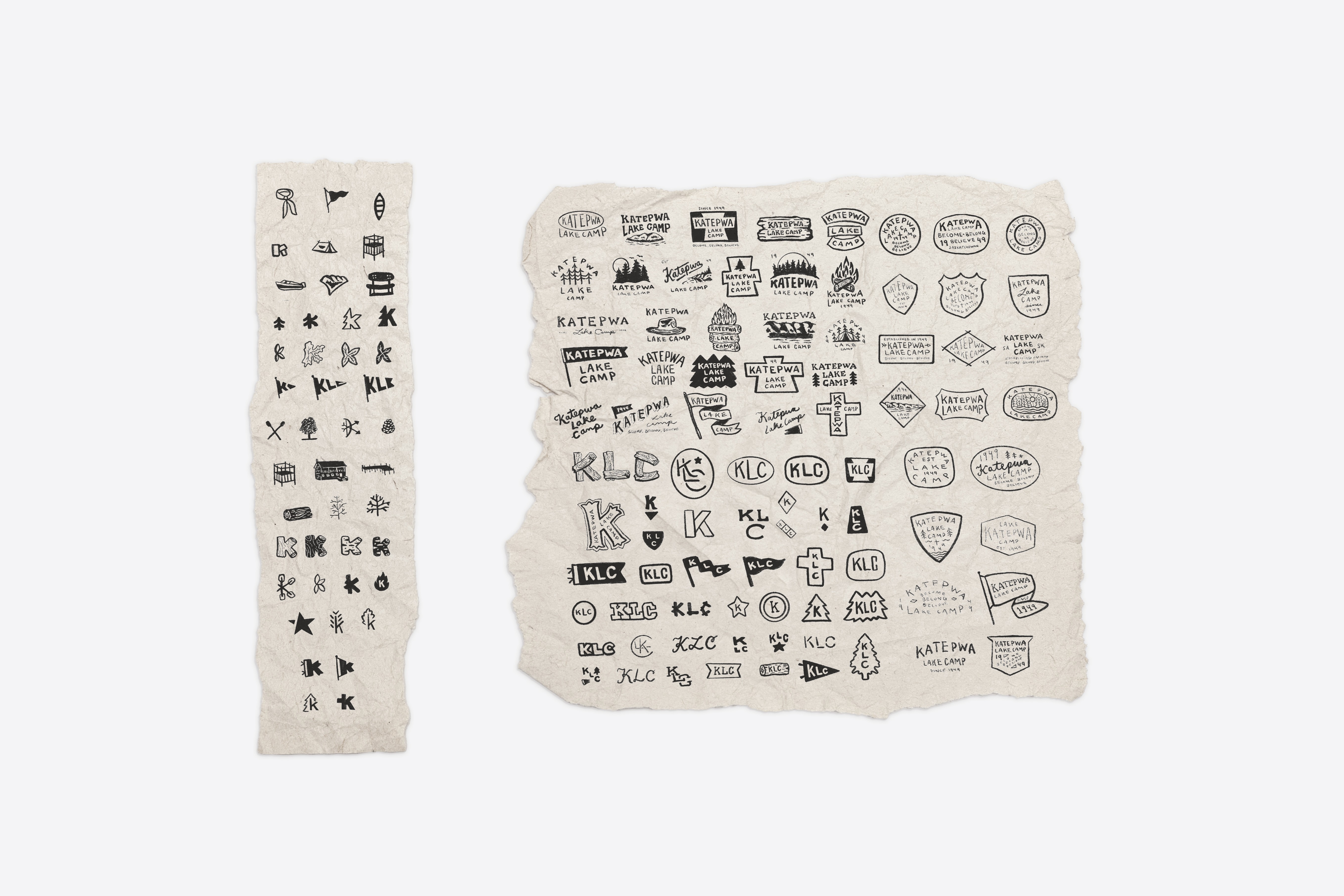 To bring more personality and versatility to the brand, a set of supporting icons was created based on meaningful camp visuals. The first is a stylized “K” formed by a bow and two arrows, a subtle reference to classic summer camps and the spirit of outdoor adventure. The second icon represents Turnbell Lodge, the central gathering place that includes a chapel and common space. The third depicts a beloved bench on the dock, built from old wakeboards, a quirky and nostalgic detail that has become a symbol of camp memories for many.