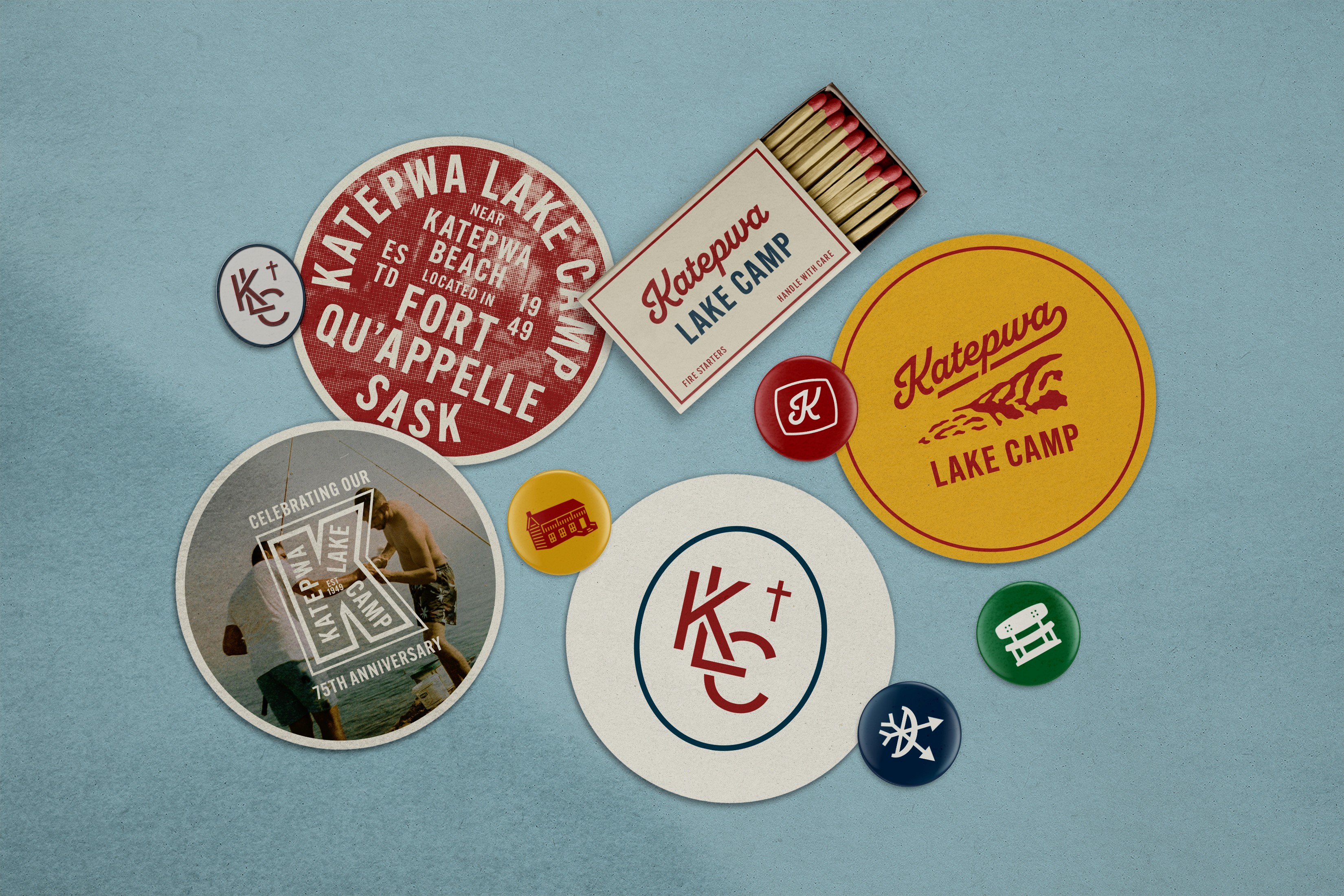 The brand’s colour palette draws from the camp itself, with warm heritage reds, deep navy accents, and neutral tones that feel rooted in the natural landscape. A set of supporting marks was developed including a 75th Anniversary badge, a stylized “K” monogram, and a KLC monogram featuring a small cross. These elements were designed to work across apparel, patches, signage, and merchandise, giving the camp a visual toolkit that feels nostalgic, practical, and distinctly Katepwa.