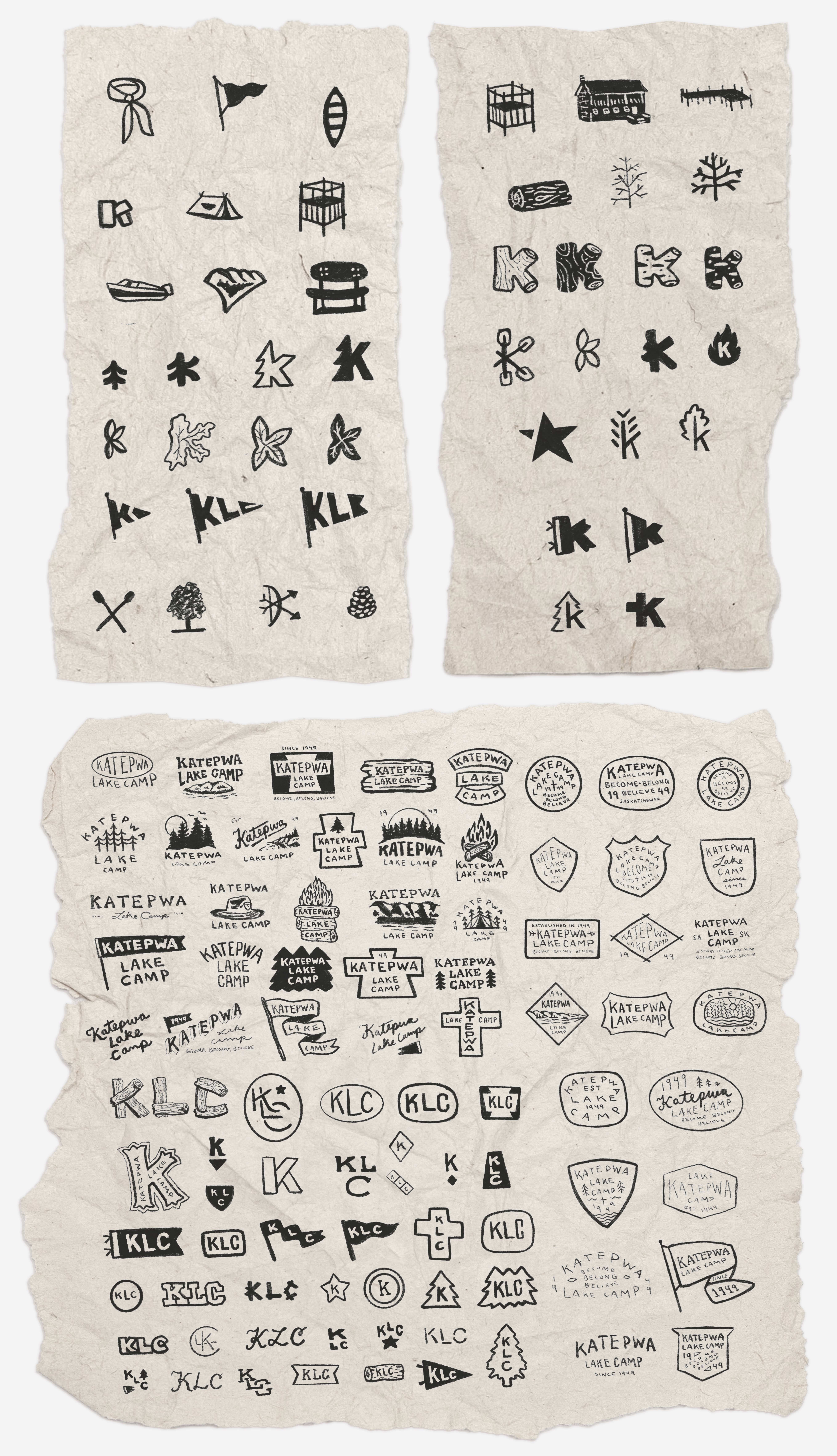 To kick things off, I explored a wide range of sketches, experimenting with possible logos, symbols, and icons that could reflect the heart of the camp. These early ideas were shared with the team to help narrow in on the directions that felt most promising. Over the years, the camp had cycled through multiple logos, each reflecting different eras and ideas. The most recent mark attempted to include fire, water, hills, and waves all in one, but struggled with legibility and versatility, especially at small sizes or outside of a horizontal layout. What the camp needed was a logo they could own with confidence — something clear, timeless, and built to last for the next 75 years and beyond.