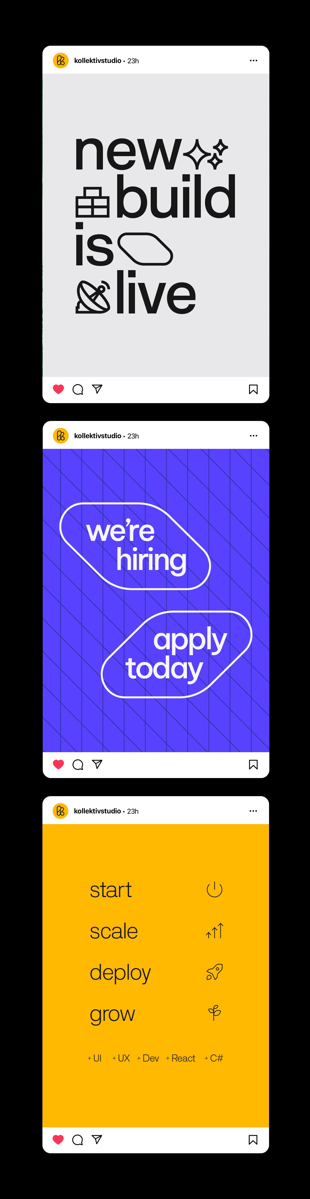 The kollektiv identity is built on a modern, structured design system that brings clarity and personality together. Typography is led by HK Requisite, a compact grotesk that reflects the brand’s precision and confident tone. It’s paired with Figtree for a clean, contemporary feel, and occasionally joined by Courier Prime, which adds a typewriter-like quality that ties into the development side of the studio’s work. This type system feels digital, intentional, and flexible across touchpoints.