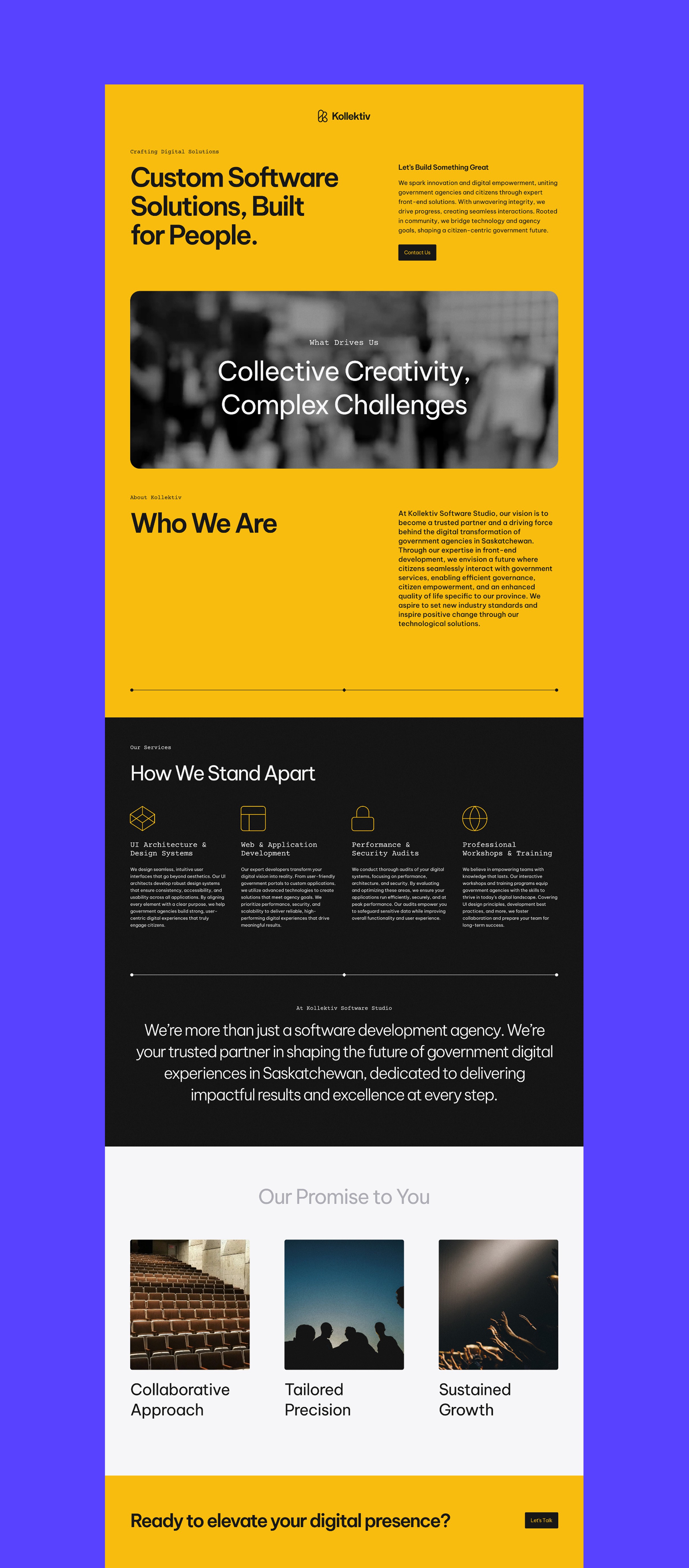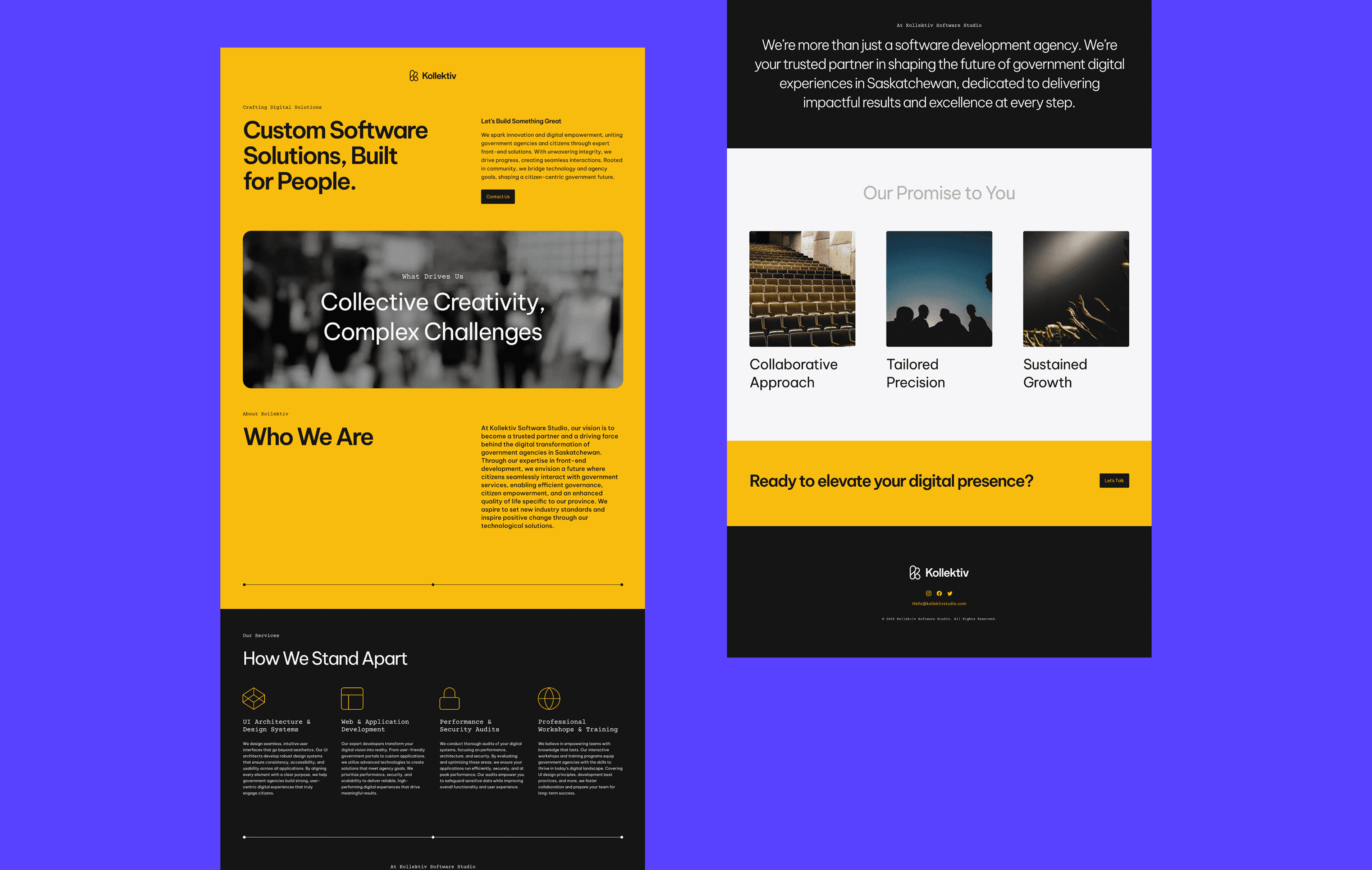 Kollektiv Software Studio partners with enterprise-level government organizations and crown corporations to design and develop custom software solutions that empower citizens, foster connection, and drive long-term success through innovation and collaboration.